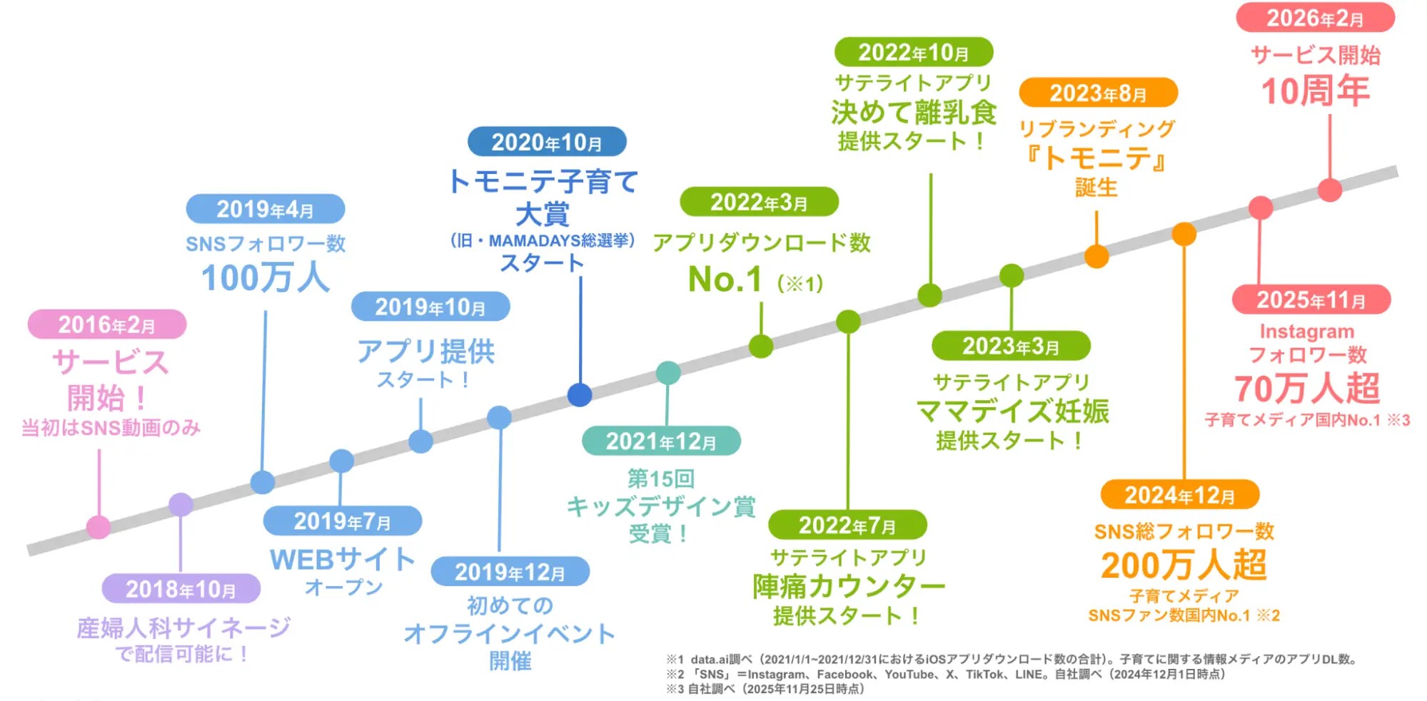 『トモニテ』は、2016年2月に『MAMADAYS』としてサービスを開始し、リブランディングを経て、今年2月に10周年を迎えました。「ともに手をとる子育てを。」というミッションのもと、この10年間私たちは、社会情勢やライフスタイルの変化に真摯に向き合い、子育て家庭に寄り添う情報発信に努めてまいりました。その結果、現在Instagramのフォロワー数が70万人を突破し、子育てメディアInstagramアカウントフォロワー数No.1*、さらにはSNSフォロワー数においても国内No.1を誇る子育てメディアへと成長することができました。
